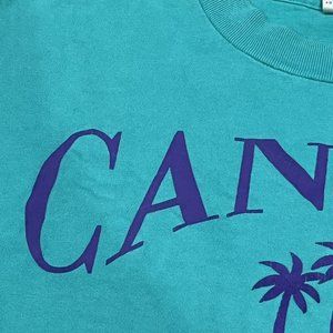 This is a vintage 90s single stitch teal shirt. It has Cancun in purple lettering with three palm trees. Oneita tag and fabric is distressed with all over light spots from multiple washings. Size is determined by tag so please also see measurements. Thanks!