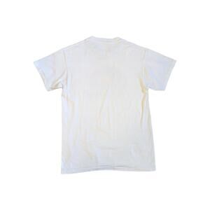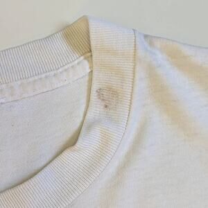 There is a small mark on the neckline and some cracking/fading on the graphic due to age. No other flaws!