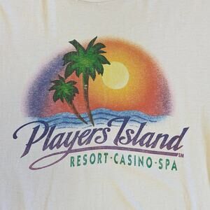 Single stitch graphic tee shirt, crew neckline, "Players Island Resort-Casino-Spa" graphic print, short sleeves, unisex.
