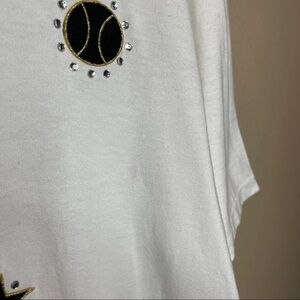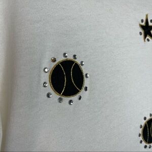 White single stitch short sleeve tee with black/gold embroidered tennis balls with clear rhinestones on the front