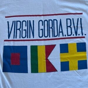 Vintage Virgin Gorda BVI Short Sleeve Flag T-Shirt. Single stitch at sleeves and hem. Great preowned condition with light wash wear. It has (2) minor stains, which are not easy to see. Tag removed, see measurements for best fit. This measures as a modern small.