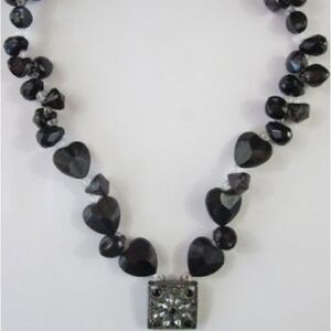 Vintage single Strand silver tone necklace with black heart shaped acrylic cluster beads, clear crystals, square silver tone pendant with black stones & rhinestones and barrel screw clasp.