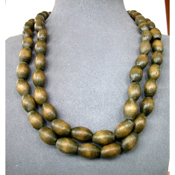 A stylish double-strand necklace featuring smooth, olive-green and brown-toned wooden beads. Ideal for those seeking an earthy, vintage-inspired accessory.