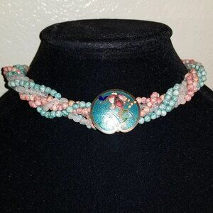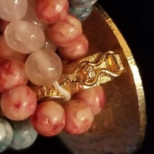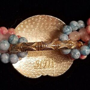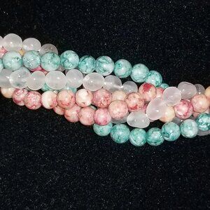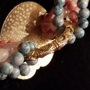 This stunning necklace features a blend of pink and blue quartz beads, perfect for adding a pop of color to any outfit. The intricate design showcases a beautiful centerpiece, making it a standout accessory.