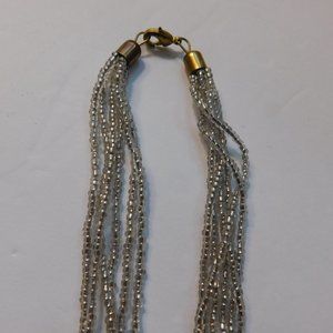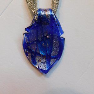Pretty necklace. The strands are small plastic beads. Glass pendant is blue & silver with gold color flakes in the middle & towards the bottom.