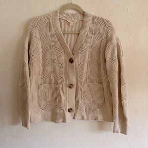This Terra and Sky cardigan is the ultimate light academia piece. It has long sleeves, 2 front pockets, 3 large buttons all in a beautiful light tan color.