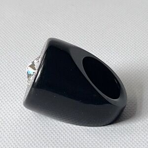 Vintage black flat top lucite ring with faceted rhinestone center.