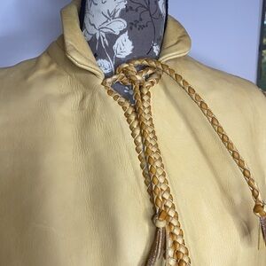 This is a beautiful one of a kind Vintage Size 6-8 Handmade Leather Western Jacket Coat with Fringe. This was hand made from beautiful golden beige color leather and fringe. Braided trim and two ties one at the neck and another at the waist. Suede interior. Semi notch rounded collar. Two slip in pockets.