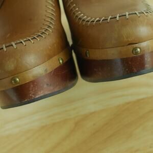 Scuffs, wear, discoloration throughout leather uppers. Wear to insole. Black scuffs on heels. Minor wear to soles and heels.