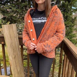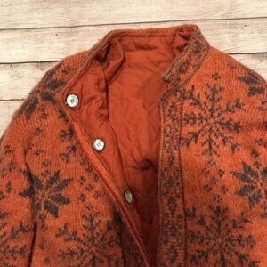 In great condition minor wear and loose strings not noticeable Zips closes on the sweater side Buttons closed on the jacket size. Would best for a large Heavy wool sweater Orange color.