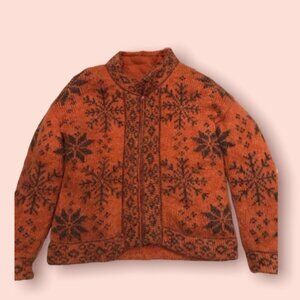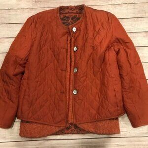 In great condition minor wear and loose strings not noticeable Zips closes on the sweater side Buttons closed on the jacket size. Would best for a large Heavy wool sweater Orange color.