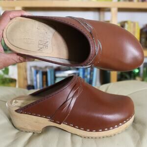 Authentic Skane Toffeln Swedish clogs in rich cognac brown leather. These vintage-inspired wooden mules combine practicality with rustic charm for the perfect statement footwear piece.