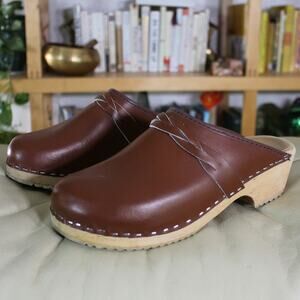 Vintage Skane Toffeln Swedish Brown Leather Wooden Clogs 39 - Cottagecore Scandinavian Classic