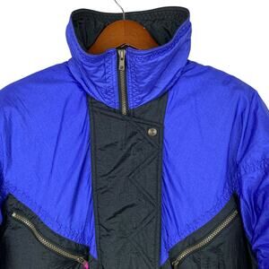 Vintage Ski jacket in women's size medium. Full zip with snap closure at the front. Long sleeves with elastic cuffs. Black and purple/blue color. Nylon outer with polyester filling. Machine washable. Four outer pockets and one inner pocket. Excellent condition except that some of the padding is bunched up at the left shoulder.