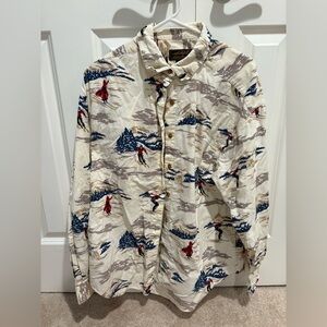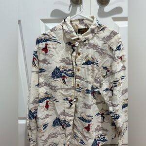 Add a touch of vintage charm to your wardrobe with this long-sleeve button-down shirt, featuring a playful skiing and mountain print in deep navy, bold red, and soft gray tones on a warm cream background. Crafted from a corduroy fabric, it offers a relaxed fit with a classic collar and wooden-style buttons for a rustic finish. Ideal for après-ski vibes or simply standing out in casual settings, this shirt pairs well with denim or chinos for an effortlessly cool look.