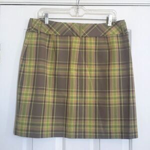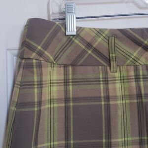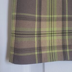 Fantastic and unique color combination that works year round. Lime / chartreuse green with a gray / taupe / tan plaid. (skirt is photographing a little darker than it is in real life) Belt loops, small vent in front, zipper fly with button and tab/hook closures. Fully lined. Waist 34" Length 20" Excellent condition.