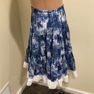 Excellent condition no stains rips or fading. Stretchy elastic waistband, pull on style a-line tiered skirt. No tags inside. It would best fit a small and feels like cotton or a cotton blend. The material is not stretchy.