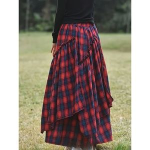 [Vintage Skirt] Vintage-Inspired Red & Black Plaid Maxi Skirt with Asymmetrical