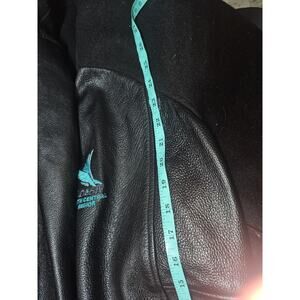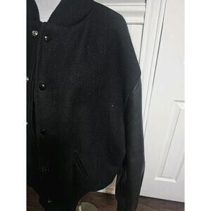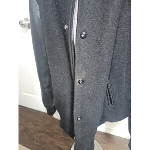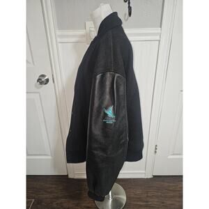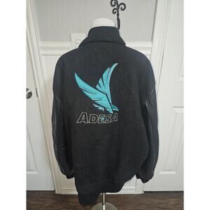 The Vintage Skookum Adesa Wool Leather Letterman Varsity Jacket in Size 54 is a classic piece of outerwear made in the USA. Crafted from wool with a leather lining, this jacket features embroidered Adesa Wings on the back, making it a unique and stylish choice for any occasion. The snap closure, band collar, and pockets add practicality to this mid-length jacket, which can be worn in all seasons for any number of activities such as track and field, rugby, hunting, or baseball. Perfect for those looking to personalize their wardrobe with a piece of heritage and quality craftsmanship.
