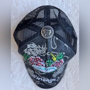 Vintage skull, flowers, and rhinestone trucker hat.