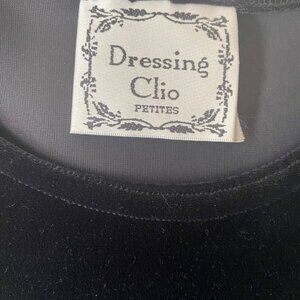 This elegant vintage-inspired petite dress features luxurious black velvet and delicate sheer lace accents. Timeless design crafted in the USA for an era-defining look.