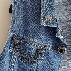 Vintage Sleeveless Jean Jacket Size L Vest Animals Pins Blue Denim 80s Music