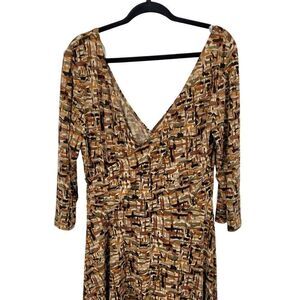 Vintage Slinky Stretch Faux Wrap Dress XL Brown Geometric Gathered Waist Mod USA