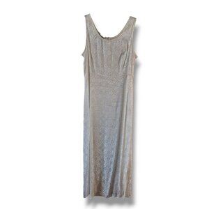 Dress is a sleeveless slip style with a back zipper, side slits, darts, and a high waist that give it a fitted, elegant look.