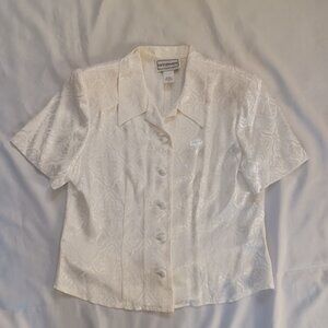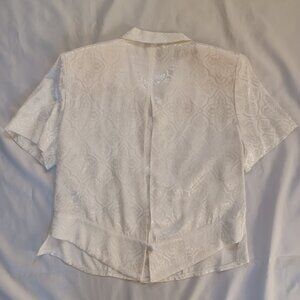 Jacket is button front, short sleeve, has shoulder pads, and a back slit with a button at the bottom that gives it an elegant flair.