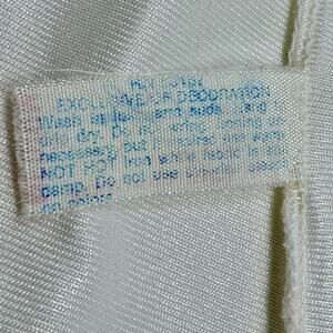 Vintage, nylon, pull-on, elastic waist, deep side slits, scalloped lace hemline. The color is slightly off-white or faint cream to my eye, like in the measurement photos.