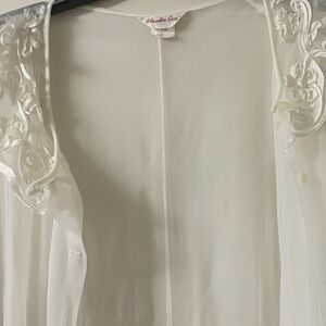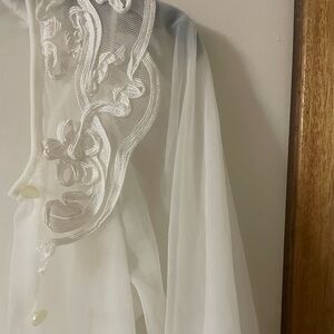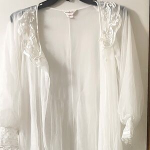 Experience luxury with this elegant, delicate, vintage, white sheer robe, perfect for adding a touch of sophistication to your sleepwear collection. Embroidered Lace on collar & Sleeves. Long & Flowing Robe with 2 Tiny Button Closures. Gorgeous Vintage Addition!