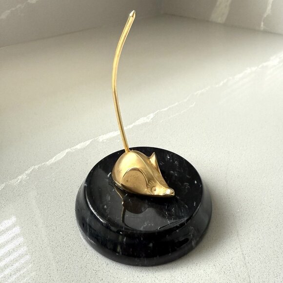 Vintage Small Brass Mouse On Marble Base Figurine Ring Holder Receipt Holder