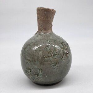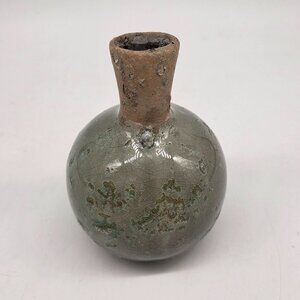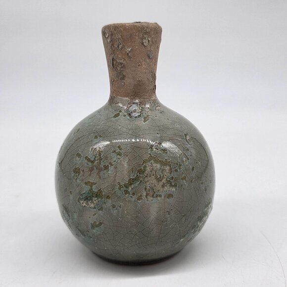 Vintage Small Brutalist Ceramic Vase Crackle Glaze & Rustic Green Brown 4.5"