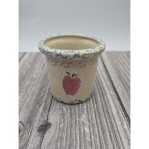 This vintage small crock features an apple and spongeware pattern, standing at a height of 3 inches. It is unmarked.