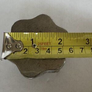 This vintage filigree jewelry box features a delicate wire mesh design with a silver-tone finish. Perfect for holding trinkets, it adds a touch of elegance to any vanity or dresser. Overall tarnish, and the mesh bottom is slightly coming away from the legs in some places. Box measures approx. 2" x 2".