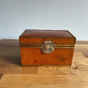 This is a beautiful small trinket or jewelry box! It is leather and a gold metal. It is very simple but a statement piece. Would be great on a coffee table, entry table, dresser, or even night stand. This box is in great condition inside and out.