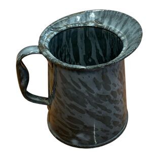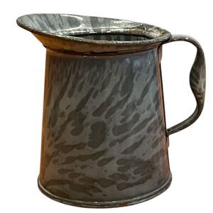 Elevate your vintage kitchenware collection with this charming Graniteware Small Measure Creamer. Featuring a distinctive mottled gray enamel finish, this piece exudes rustic elegance. The creamer is designed with a unique bulbous handle, providing both functionality and aesthetic appeal.