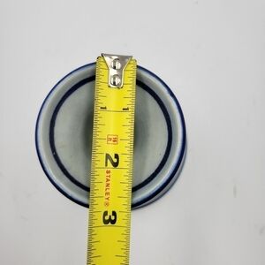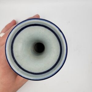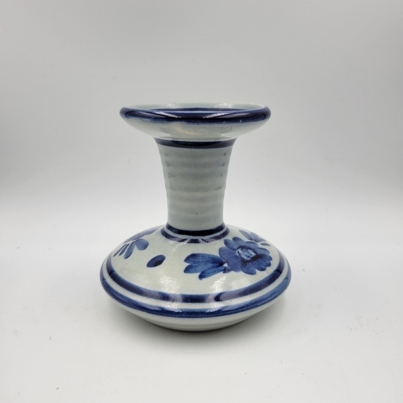 Small gray stoneware bud vase with blue accents and flower painting. Marked on bottom and states lead free - however, I can’t quite make out the makers mark.