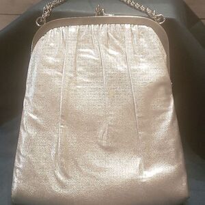 Add a touch of vintage-inspired elegance to your look with this small silver cloth handbag that has a satin lining and is accented with gleaming silvertone trim and a classic kiss-lock closure. The front features a beautifully embossed design that catches the light and adds texture and charm. Can be used as a clutch handbag or the 7-1/2" double silvertone chain lets you wear it comfortably as a shoulder bag—perfect for evening outings or special occasions. Sleek, sophisticated, and effortlessly stylish.