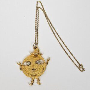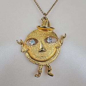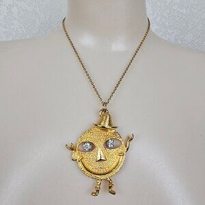 Vintage Smiley Face Rhinestone Pendant Necklace Dangle Eyes Cowboy Hat Gold Tone