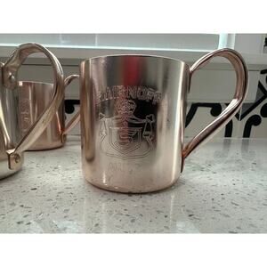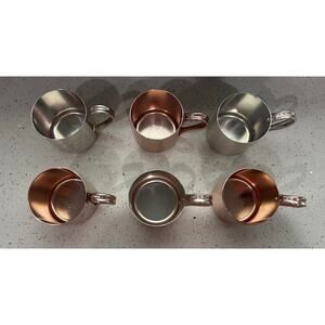 Add a touch of Vintage charm to your barware collection with this set of six Smirnoff Mule Copper Moscow Mule mugs! These mugs are perfect for serving up classic Moscow Mules or any other cold beverage. Each mug is made of high-quality copper and features the iconic Smirnoff logo. They're in great condition and ready to be enjoyed for years to come. Cheers to good times and great drinks!