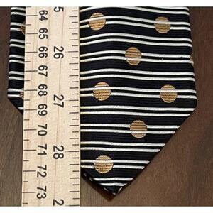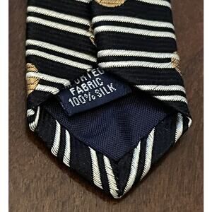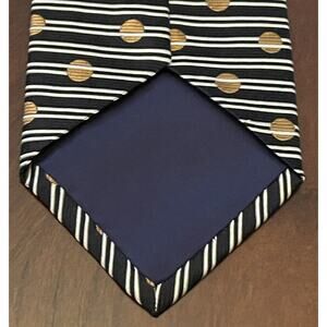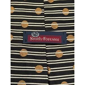 Elevate your formal look with this vintage Smith Forester black and gold polka dot silk tie. Crafted in the United States, this designer tie is perfect for weddings or preppy outfits. The classic length (57"-60") and width provide a comfortable fit for men.