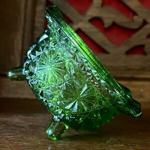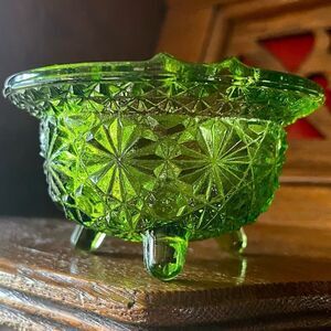 Smith Glass Daisy and Button Green Glass Footed Ashtray, Incense , Trinket Bowl
