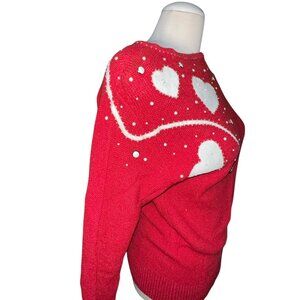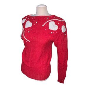 This is a Vintage Smiths Aspen Red Knit Sweater W/ White Heart Design & Beaded Detailing.