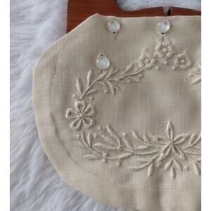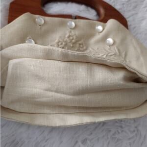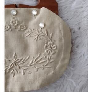 Vintage Smith's Linen Floral-Embroidered Bermuda Handbag Wood Handle Cottagecore