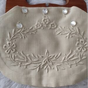 Vintage Smith's Linen Floral-Embroidered Bermuda Handbag with Wood Handle