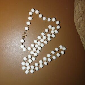 This vintage milk glass bead necklace exudes timeless charm with its 36-inch length and classic gold-tone clasp. A beautiful statement piece for collectors.