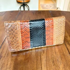 70s/80s snake skin multi-tone leather envelope clutch. Folds over with snap closure. Leather Lined. Multiple pockets. Super sleek and fashionable.