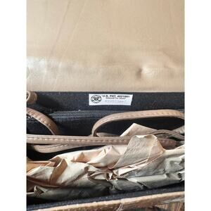 Step out with classic vintage style. This taupe faux snakeskin clutch features a structured front, ruched back panel, and a magnetic snap closure patented in 1977 (U.S. Patent No. 4021891). The interior is lined with black fabric and includes one zippered pocket and a matching strap tucked inside, allowing you to carry it as a clutch or shoulder bag.
