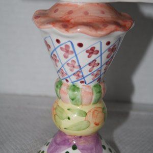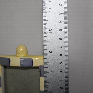 This vintage ceramic picture frame features a fun snow cone design, perfect for adding a touch of whimsy to your baby's nursery. Measuring 9 inches tall, it can hold a 2x3 photo of your little one. The frame is in great shape and ready to be displayed. The frame's brand is unknown, but the colorful and playful design makes it a great addition to any baby's room. It is also suitable for both boys and girls, with a food and drink theme that is sure to bring a smile to anyone's face. This unique keepsake is sure to become a cherished item for years to come.